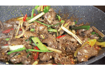 当鲜嫩多汁的牛肉在热油中翻滚时,牛肉中的肌红蛋白升华为美味的肉汁。
