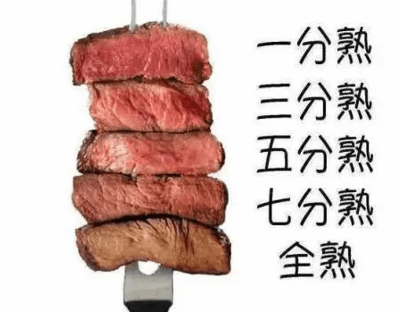 总的来说,随着牛排越来越熟,牛排的口感会越来越硬,汁水也变得更少。三分、五分和七分是相对来说口感比较好的熟度。