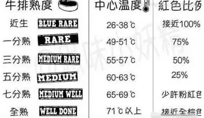 牛排的熟度其实是牛排的中心温度决定的,中心温度越低,牛排红色部分(不熟)的比例就越高。